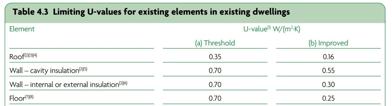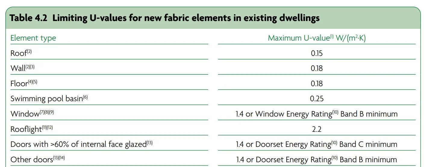 The U-value of a replacement fabric element in an existing dwelling should both be no worse than that of the element being replaced and meet the limiting standards in Table 4.2.